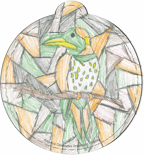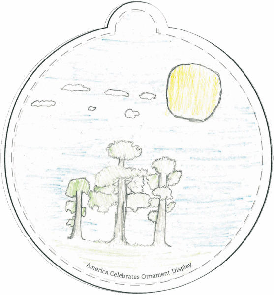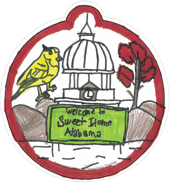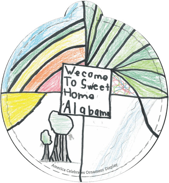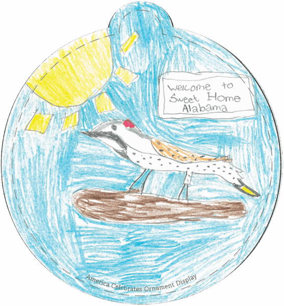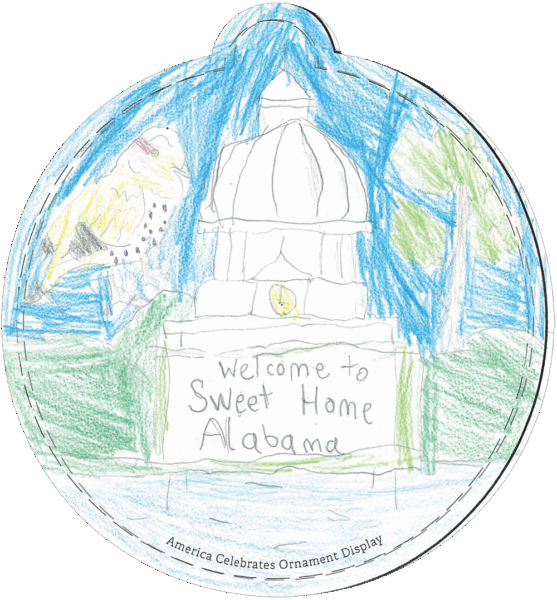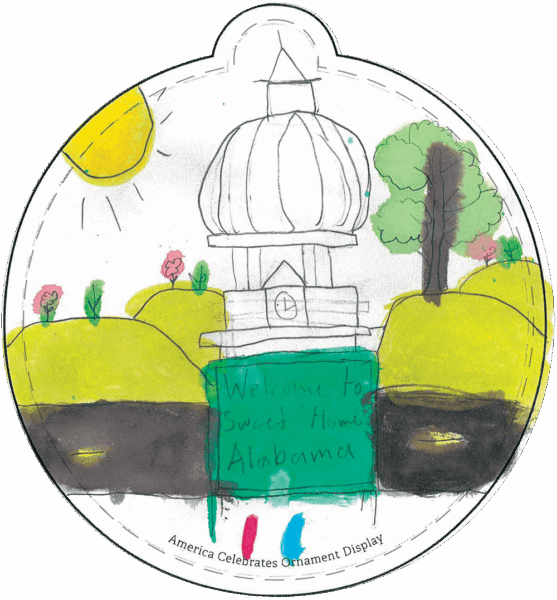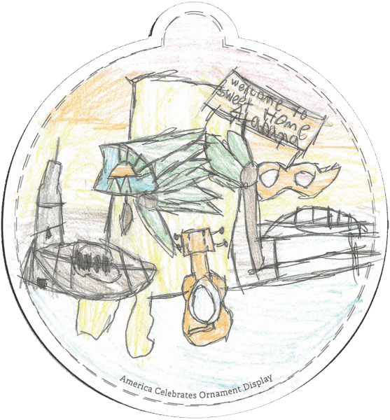 “4th and 5th-grade students at Montgomery Christian School designed the ornaments below. They began by looking at pictures of Alabama symbols, landmarks, culture, and landforms. The students had an opportunity to share what they think makes Alabama beautiful and brainstorm what they pictured for their ornaments. They were provided with various art media and allowed to choose the medium they wanted to use.” – Stephanie P., Teacher