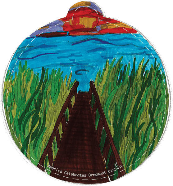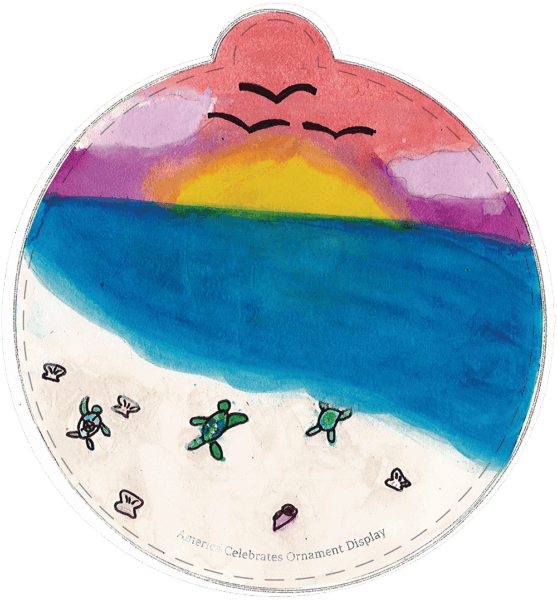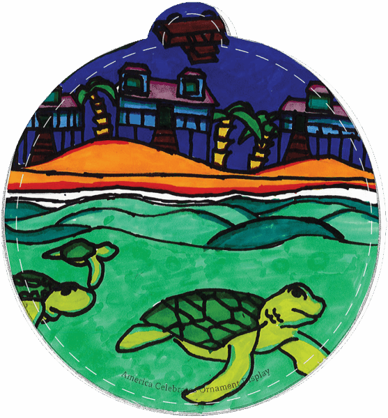 I created an ornament with baby sea turtles crawling in the water because I love the ocean and sea animals, especially sea turtles. I think the most beautiful thing about North Carolina is the sunsets, so that is why I put a sunset in the background of the baby turtles crawling to the sea. I thought it would be fun to draw two things mixed together that I love to make the perfect art to represent the beauty of North Carolina.