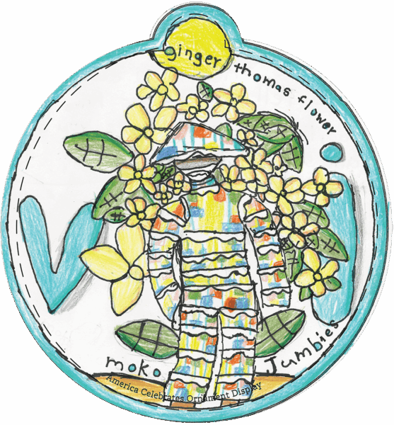 My drawing is a Moko Jumbie that is believed to protect our islands from bad spirits. Moko Jumbies could also be seen in Carnival and other festivals in the territory. The Ginger Thomas flower is the territorial flower of the Virgin Islands. I drew the Moko Jumbie to tell you that we have protectors of the islands like what the armed forces do. Visit the Virgin Islands and see the Moko Jumbie.